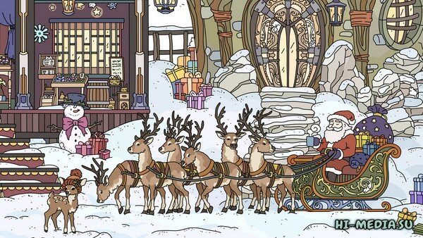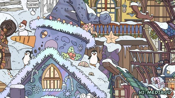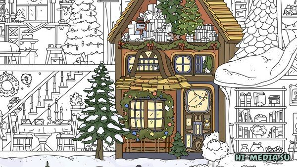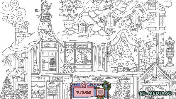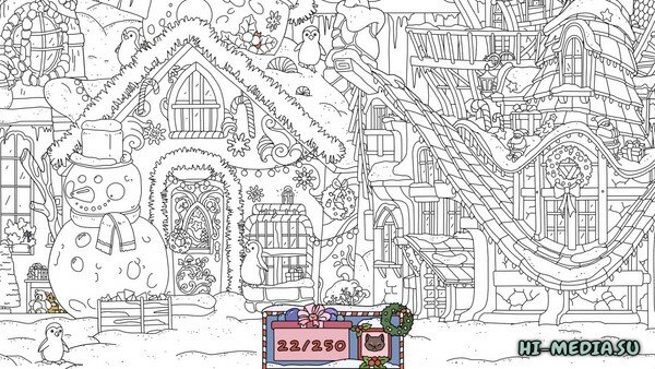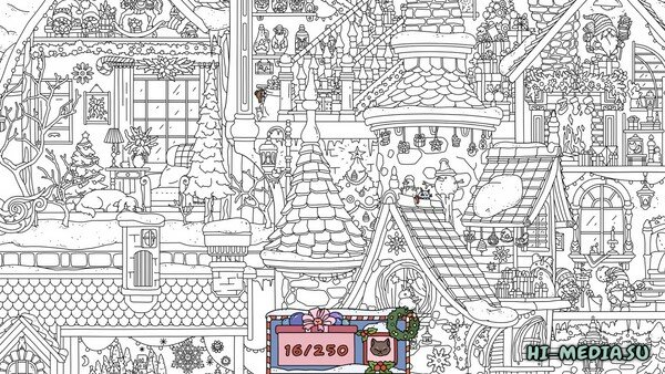 Найдите в сказочном новогоднем городке милых кошек и раскрасьте черно-белые локации цветными красками.