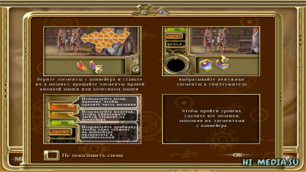 В этой увлекательной игре вам предстоит восстановить артефакт, разрушенный в незапамятные времена. Для этого нужно решить множество увлекательных логических задачек, заполняя фишками мозаики прихотливой формы. Фишки поступают на экран одна за другой. Три разных режима игры.
